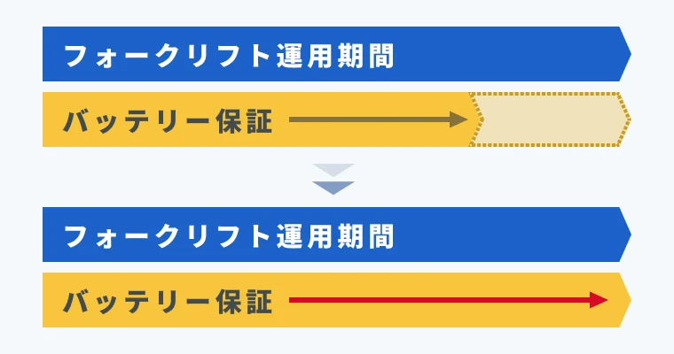 フォークリフトのバッテリー稼働を保証するバッテリーメンテンナンスパッケージです。メンテナンス契約期間中にバッテリーの稼働保証をする事でお客様はフォークリフトの不調の影響を受けずに安定したフォークリフト稼働を実現する事が出来ます。