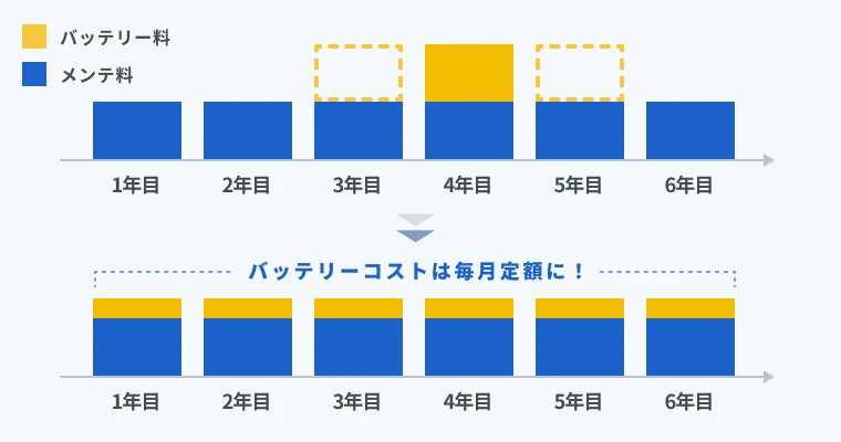 バッテリーコストは毎月定額(サービス料)となり平準化されます。これにより、見立ての難しいバッテリー交換予算を構成する必要がなくなります。定額の合算は、新品バッテリーに交換した場合と比較してコストメリットがあるように設定されています。