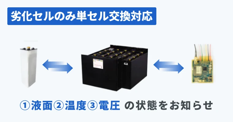 遠隔監視システム付帯の4年稼働保証付きバッテリーメンテナンスパッケージです。バッテリーコストを毎月定額化し、稼働を保証することで、お客様はバッテリーの不調の影響を受けずに安定したフォークリフト稼働を実現できます。