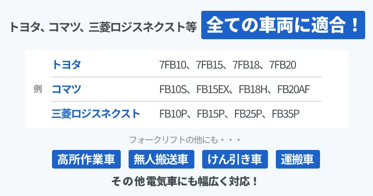 トヨタ、コマツ、三菱ロジスネクスト(旧ニチユ)など、主要な国内フォークリフトメーカーのほぼ全ての車両に適合します(一部特殊車両を除く)。フォークリフトの他にも、高所作業車、無人搬送車(AGV/AGF)、けん引車、運搬車など、その他電気車にも幅広く対応可能です。
